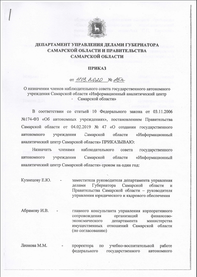 Приказ о назначении членов наблюдательного совета ГАУ СО ИАЦ на 2020 год