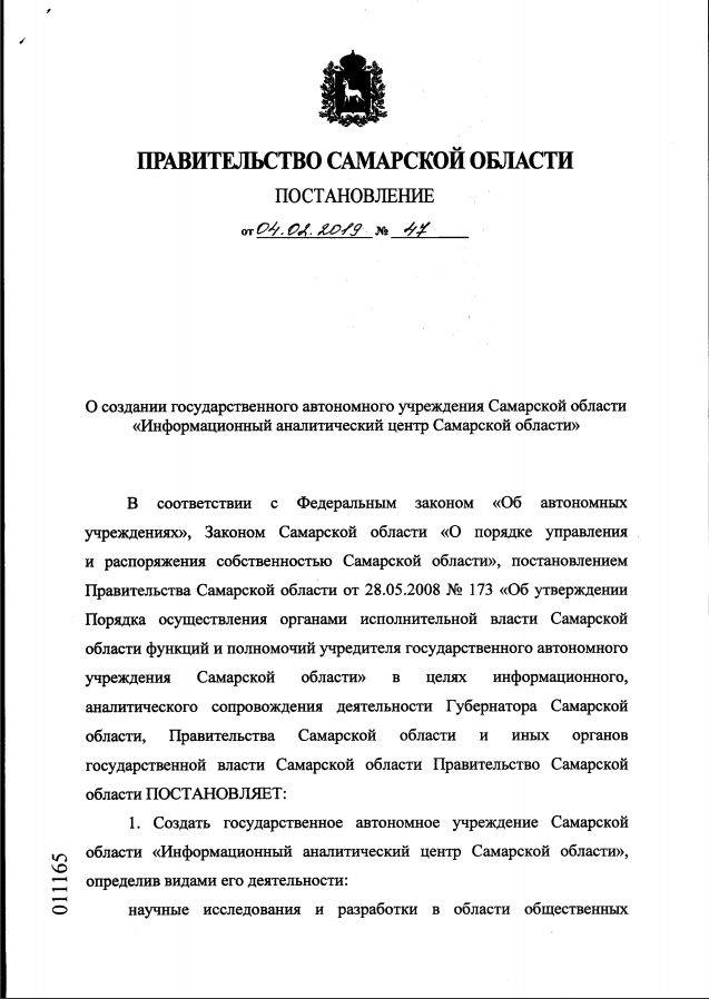 Постановление Правительства Самарской области «О создании государственного автономного учреждения Самарской области «Информационный аналитический центр Самарской области»